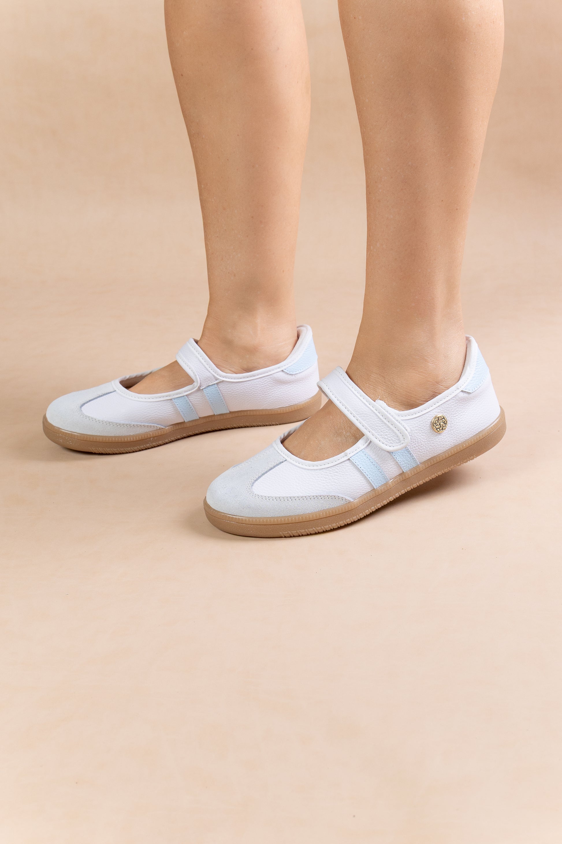 Esta baleta tipo tenis en tono blanco con detalles suaves en azul transmite una sensación de frescura, delicadeza y elegancia natural. Su diseño minimalista con correa aporta ese toque clásico que estiliza el pie y da una apariencia más refinada que un tenis tradicional.